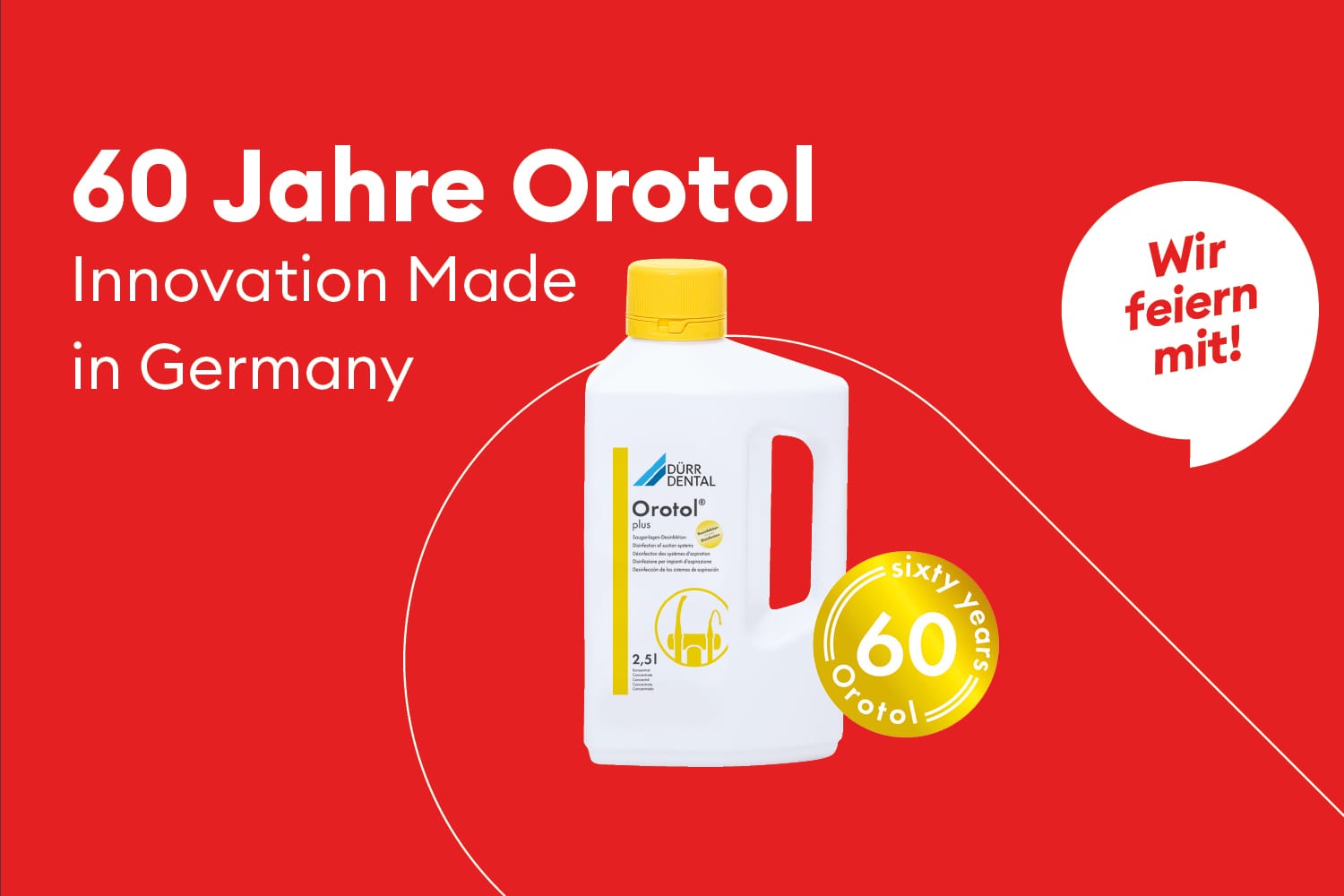 Orotol wird 60 Jahre und feiert ein bemerkenswertes Jubiläum! Dieses Produkt von DÜRR Dental hat seit seiner Einführung im Jahr 1965 die Welt der Zahnmedizin nachhaltig verändert. Als erstes Desinfektionsmittel speziell für Sauganlagen legte es einen neuen Hygienestandard fest, auf den sich Zahnarztpraxen weltweit verlassen.